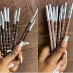A cosmetic pencil for defining and accentuating the eyebrow. It has a dark brown colour with a sharpener which is used to resharpened it.